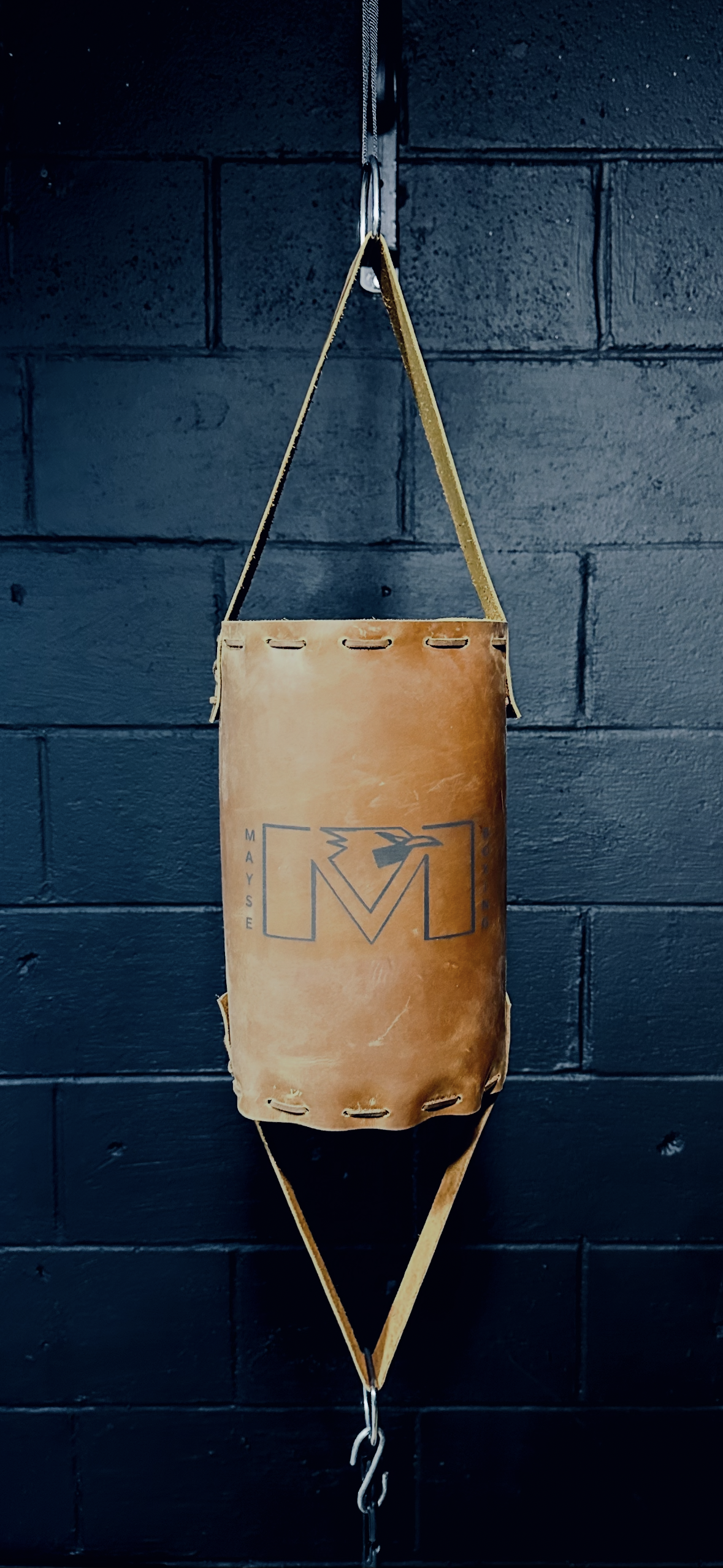 This vintage double end bag is made with 2mm full grain leather and 4mm lacing. It stands 12” tall and has a diameter of 7”. The double end bag is a crucial tool used to hone coordination, speed, and timing, along with developing defensive skills.